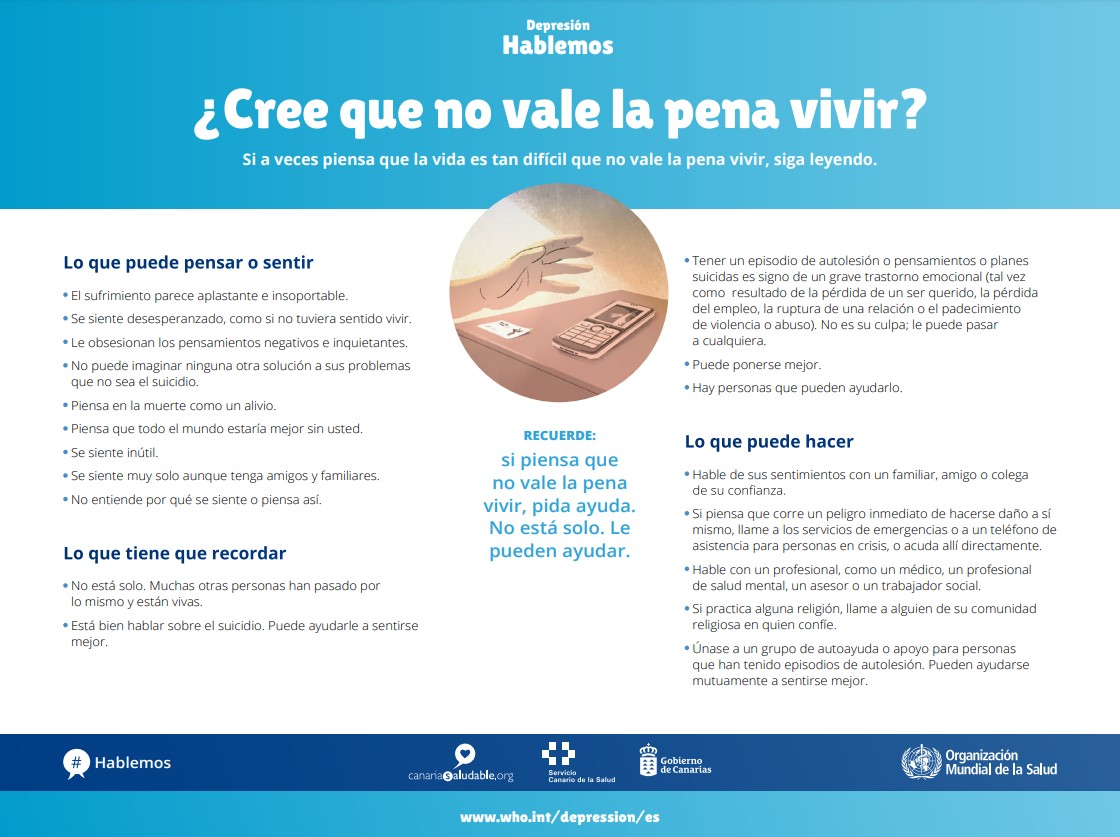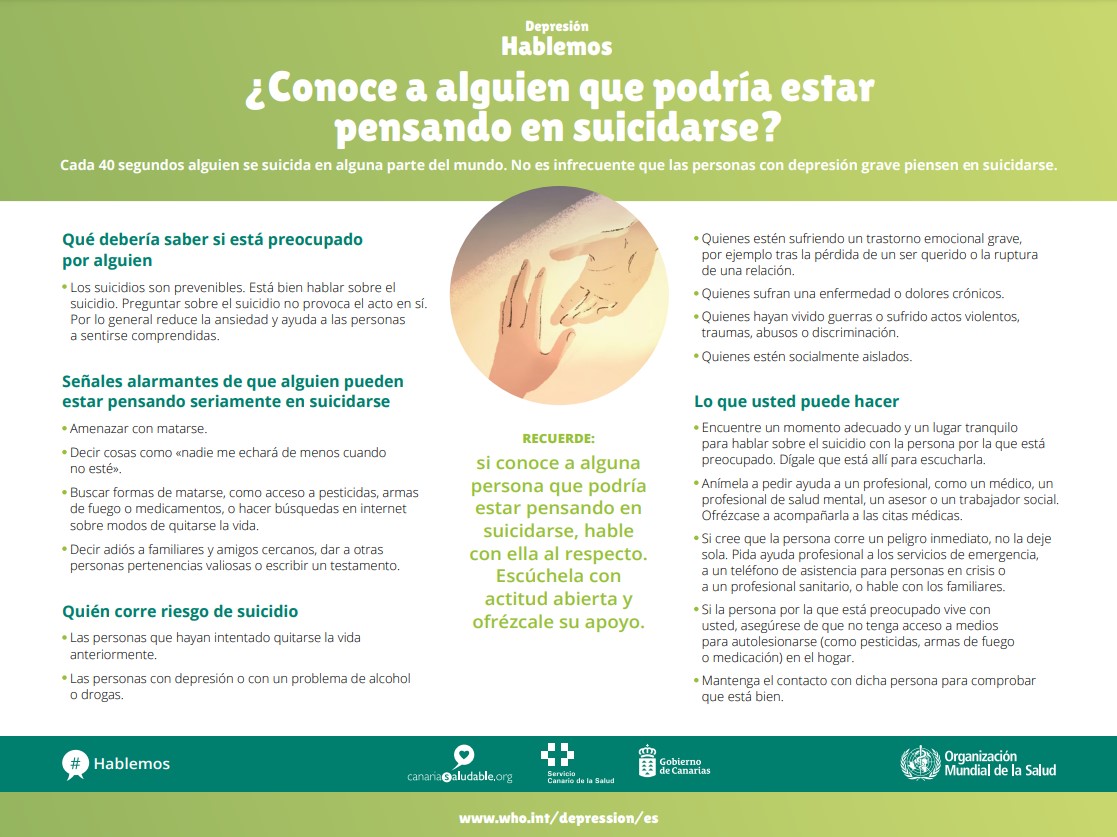 La Dirección General de Salud Pública y la Dirección General de Programas Asistenciales del Servicio Canario de la Salud de la Consejería de Sanidad del Gobierno de Canarias, se adhieren a la Campaña del Día Mundial de la Prevención del Suicidio, y que lleva por lema «Trabajando Juntos para Prevenir el Suicidio».